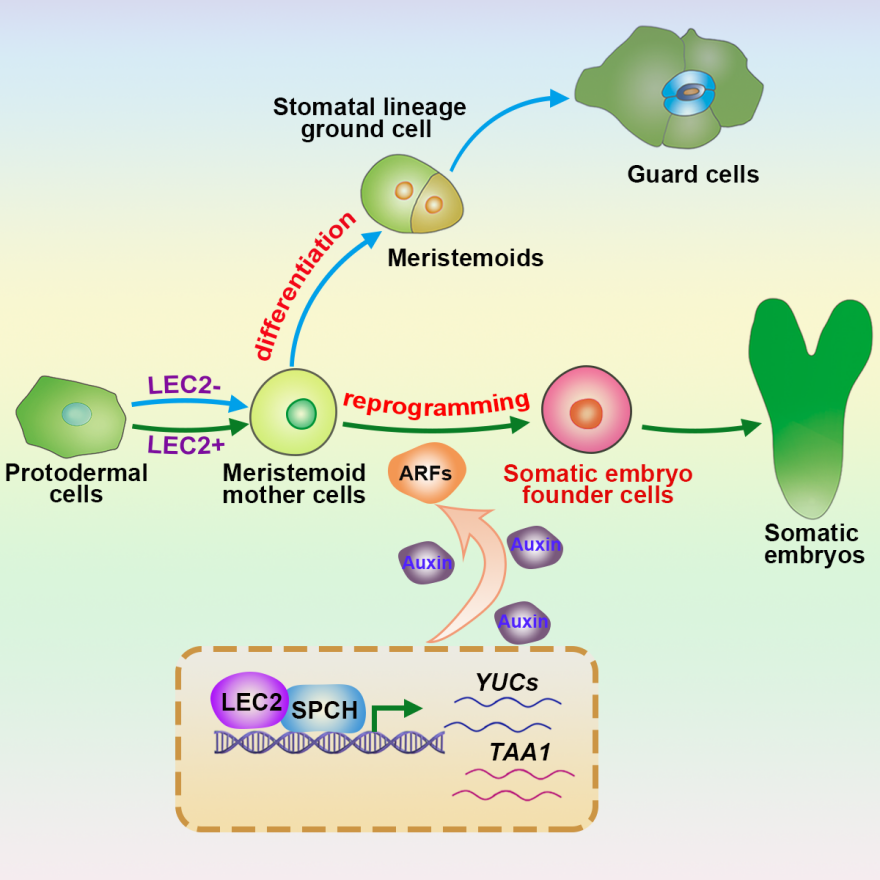 苏英华表示,团队完整记录了细胞命运重塑的完整路径,揭示了关键的命运分岔点:一条路径是气孔前体细胞继续分化为气孔;另一条路径是在大量合成内源生长素的推动下,单个体细胞被重编程为全能干细胞,走上胚胎发育之路。